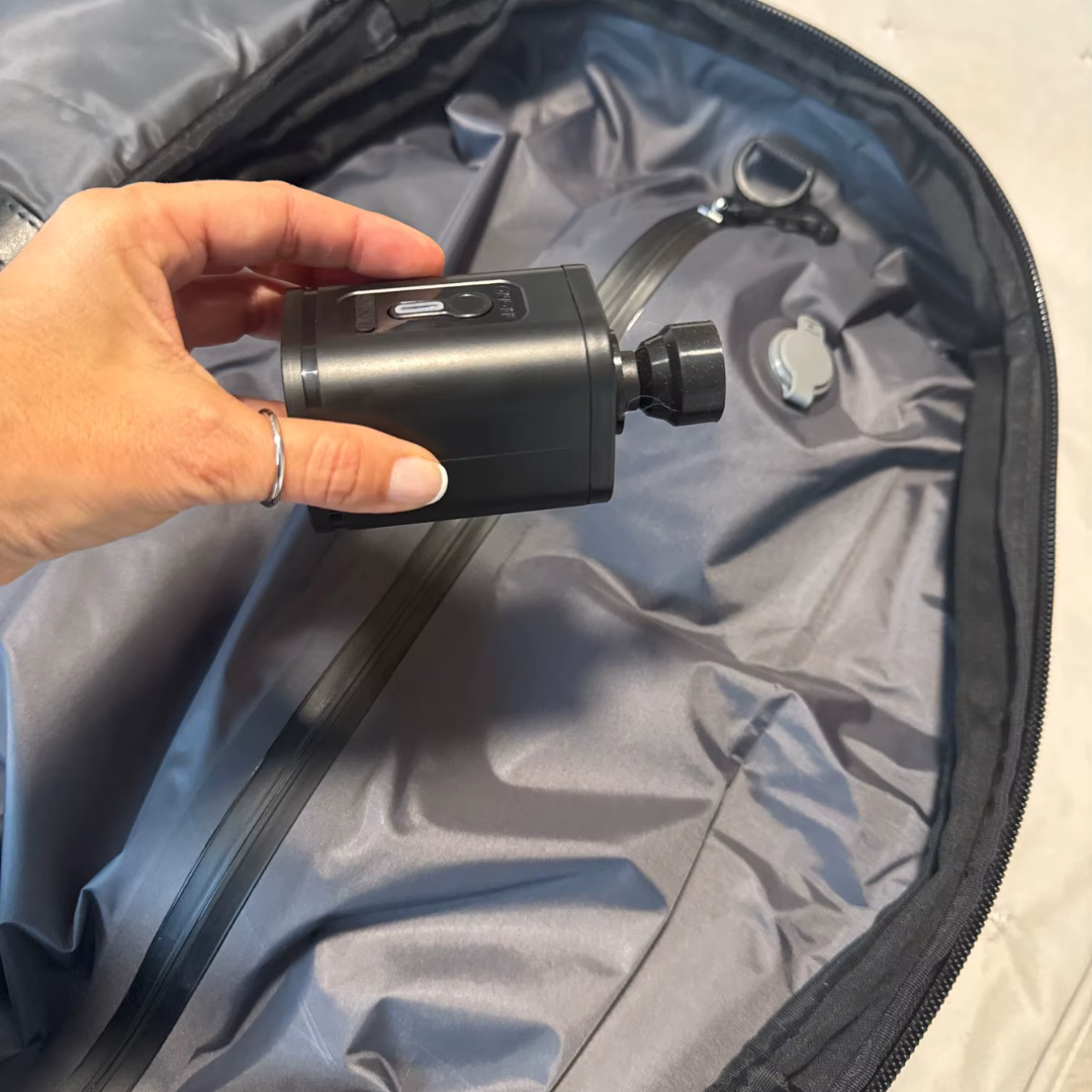 No hay problema. Simplemente abre la válvula o el cierre del compartimento de compresión para liberar el aire y acceder al interior. Una vez terminado el control, podrás volver a sellar la mochila fácilmente usando el mismo sistema integrado, sin necesidad de herramientas ni bombas externas.